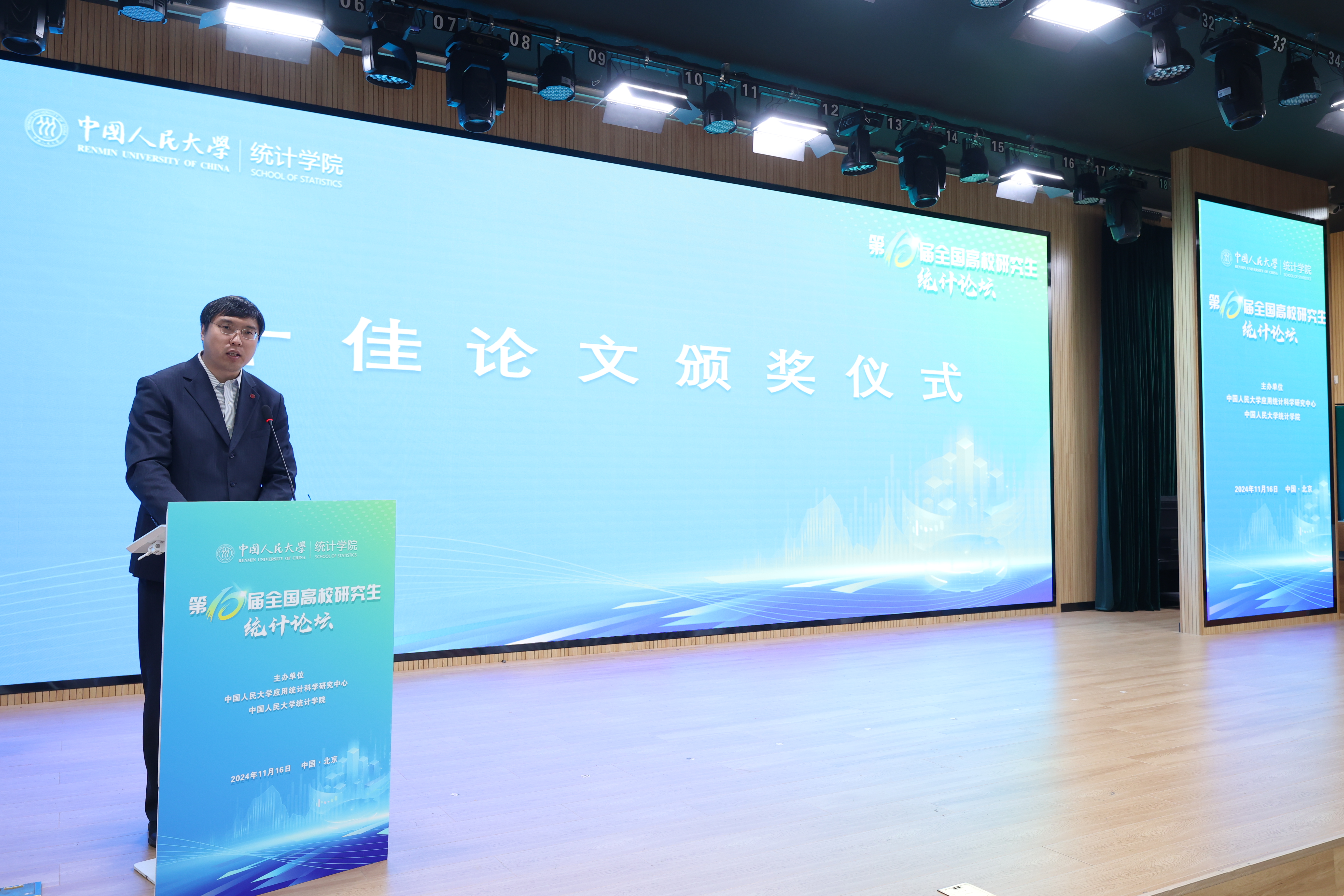 Li Yang, Dean of the School of Statistics at Renmin University of China, announced the winners of the "Top Ten Papers" at the 10th National Postgraduate Forum on Statistics. Certificates were awarded to representatives by Lü Haiqi, Director of the Institute of Statistical Science at the National Bureau of Statistics; Guo Jianhua, Convener of the Statistics Discipline Evaluation Group under the State Council Academic Degrees Committee and President of Beijing Technology and Business University; Wang Xiaojun, Secretary-General of the National Professional Degree Education Guidance Committee for Applied Statistics and Convener of the Statistics Discipline Evaluation Group under the State Council Academic Degrees Committee; and Wang Zhaojun, Executive Dean of the School of Statistics and Data Science at Nankai University.