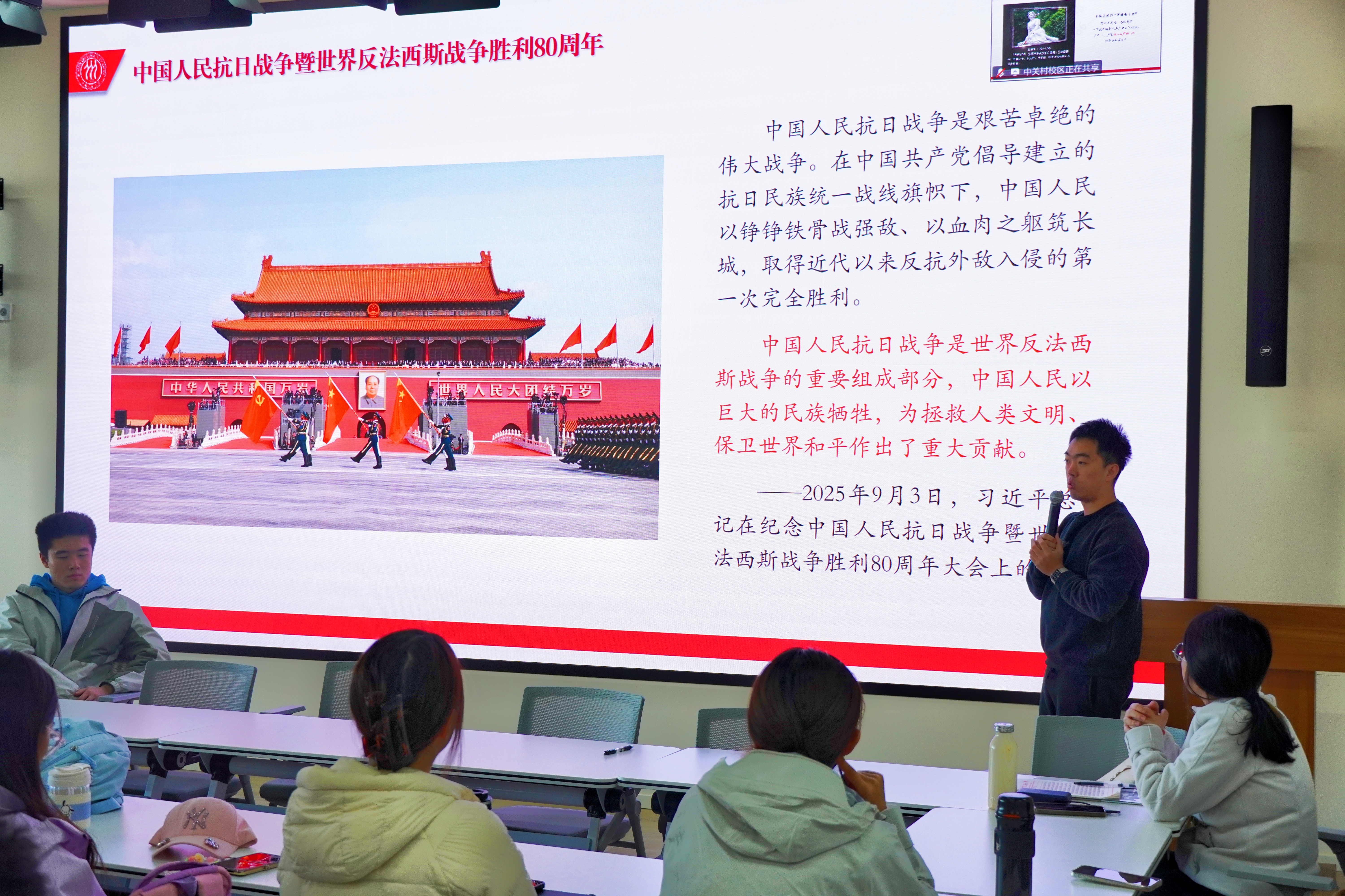 2023级本科生陈一览以纪念大会志愿服务经历为切入点,详细介绍了221名志愿者参与庆典服务的先进事迹,生动讲述志愿者们闻令而动、恪尽职守的责任担当,以及夜以继日、坚守岗位的奉献热忱,引导学员从身边榜样汲取奋进力量,呼吁大家牢记党的教诲、传承红色基因,努力成为堪当时代重任的先锋力量,为国家发展、民族振兴贡献青春智慧。