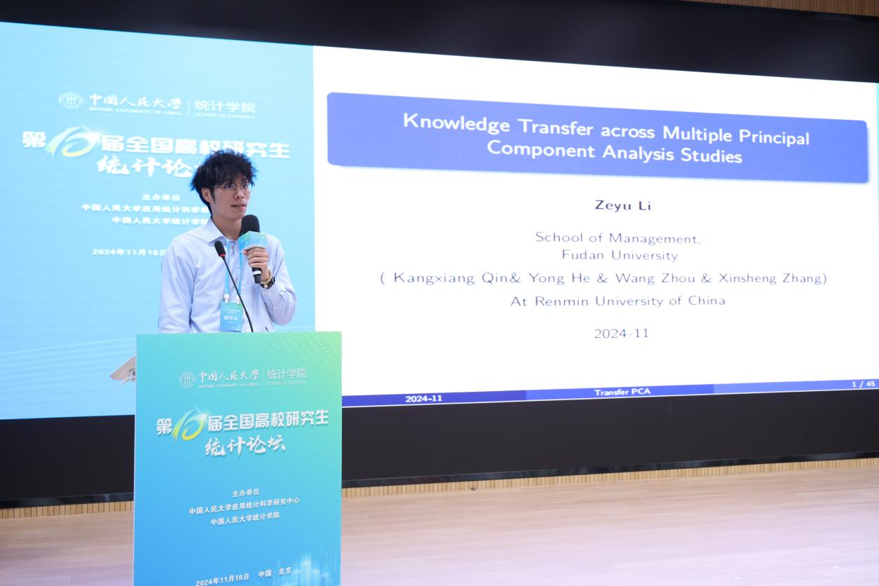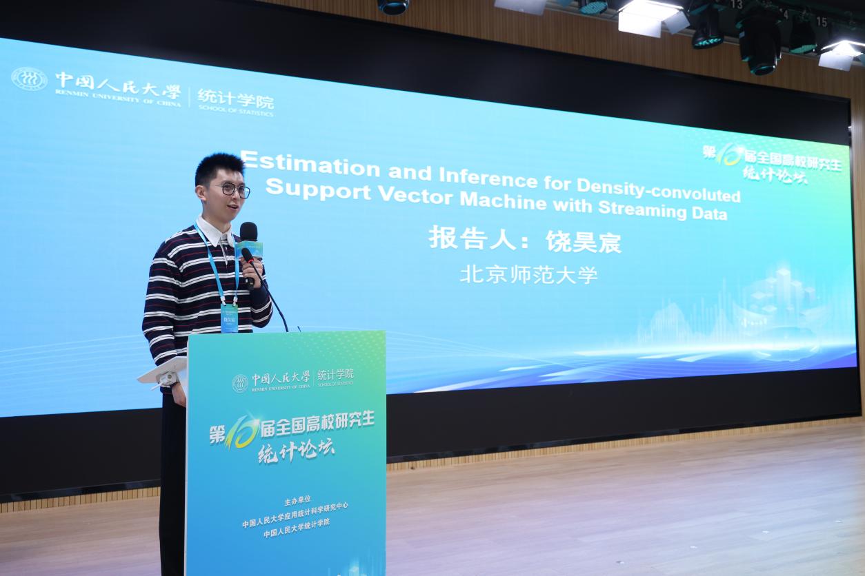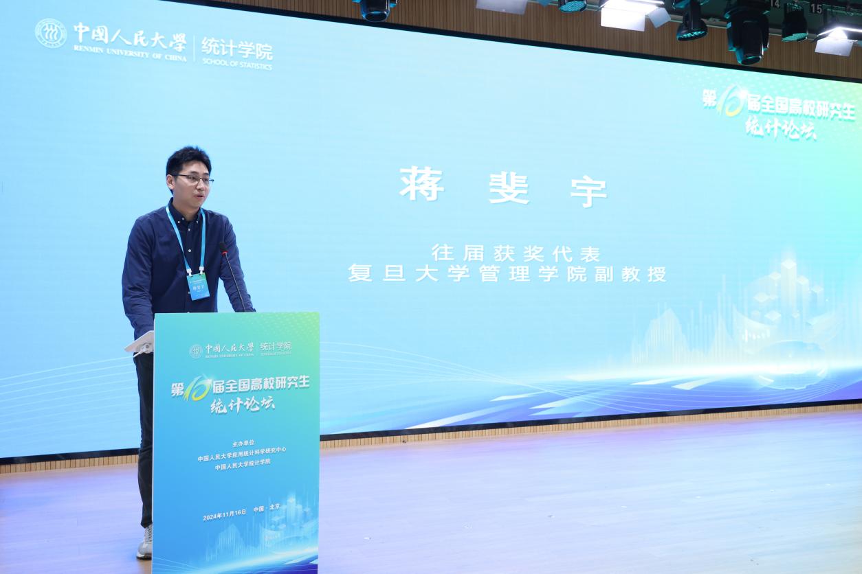 第六届全国高校研究生统计论坛“十佳论文”获奖作者、复旦大学管理公司副教授蒋斐宇分享了其学术成长经历。他认为,该论坛不仅是一个展示成果的舞台,更是一个激发创新、促进学术交流的重要平台。他鼓励各校同学们以此为契机建立联系,在交流中获得启发,找到自己热爱的方向,勇敢地去探索未知的领域。